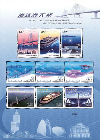 中國(guó)郵政定于10月30日發(fā)行《港珠澳大橋》紀(jì)念郵票一套3枚,郵票圖案名稱(chēng)分別為:青州橋、東人工島和海底隧道。同時(shí),中國(guó)郵政與香港郵政、澳門(mén)郵電共同印制同題材郵票小全張1枚,內(nèi)含中國(guó)郵政、香港郵政、澳門(mén)郵電郵票各3枚。