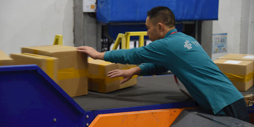 走進(jìn)包裹處理場(chǎng)地,平時(shí)在上午略顯冷清的設(shè)備上,到處可見大大小小的包裹隨著機(jī)器皮帶流動(dòng)著。在皮帶分揀機(jī)前,鮑光前遇到了一群身著紅馬甲的郵政人?!案兄x各位黨員志愿者今天來中心局幫忙網(wǎng)運(yùn)工作。這會(huì)兒皮帶分揀機(jī)缺少供件人員,5個(gè)人留在這兒,其余的和我一起去幫忙把剛送來的郵件拉到分揀區(qū)來?!闭f完,鮑光前又帶著大家往場(chǎng)地的另一端跑去。