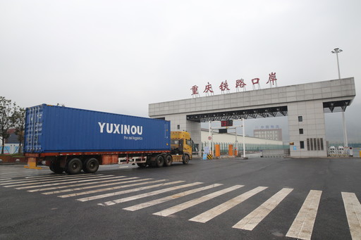 運(yùn)郵集裝箱進(jìn)入中國(guó)郵政重慶國(guó)際郵件互換局鐵路口岸中心。