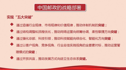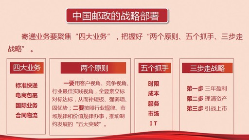 比如,對(duì)郵政寄遞業(yè)務(wù),我們的戰(zhàn)略部署就是要聚焦“四大業(yè)務(wù)”,把握好“兩個(gè)原則,五個(gè)抓手,三步走戰(zhàn)略”。