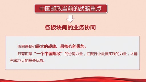 黨課關(guān)于中國(guó)郵政當(dāng)前的戰(zhàn)略重點(diǎn)就是“各板塊間的業(yè)務(wù)協(xié)同”這一論述,讓人印象深刻,既有立足現(xiàn)代中國(guó)郵政發(fā)展的歷史視野、大局格局,又體現(xiàn)了基于新時(shí)代,基于高科技、大數(shù)據(jù)廣泛運(yùn)用所帶來(lái)的新的危機(jī)與挑戰(zhàn)下的競(jìng)爭(zhēng)力思考與選擇。黨課強(qiáng)調(diào),協(xié)同是中國(guó)郵政最大的戰(zhàn)略、最核心的優(yōu)勢(shì)。協(xié)同的作用是整體遠(yuǎn)遠(yuǎn)大于部分的簡(jiǎn)單加總,但更多的時(shí)候是n次冪關(guān)系。只有匯聚“一個(gè)中國(guó)郵政”的協(xié)同力量,匯聚行業(yè)最佳實(shí)踐的力量,才能形成巨大的競(jìng)爭(zhēng)優(yōu)勢(shì)。