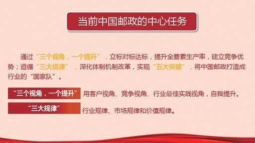 中國(guó)郵政當(dāng)前的主要矛盾是什么?黨課提出,是能力與充分競(jìng)爭(zhēng)中生存發(fā)展的矛盾。除了普遍服務(wù)以外,我們的所有業(yè)務(wù)全部是充分競(jìng)爭(zhēng)的行業(yè),可我們的競(jìng)爭(zhēng)力卻并不容樂(lè)觀。大家可以認(rèn)真思考一下,我們寄遞業(yè)務(wù)的競(jìng)爭(zhēng)力是什么?郵儲(chǔ)銀行的競(jìng)爭(zhēng)力是什么?中郵保險(xiǎn)的競(jìng)爭(zhēng)力是什么?農(nóng)村電商有沒(méi)有競(jìng)爭(zhēng)力?因此,中國(guó)郵政當(dāng)前的中心任務(wù)就是要通過(guò)“三個(gè)視角,一個(gè)提升”(客戶的視角、競(jìng)爭(zhēng)的視角、行業(yè)最佳實(shí)踐的視角,自我提升),立標(biāo)對(duì)標(biāo)達(dá)標(biāo),提升全要素生產(chǎn)率,建立競(jìng)爭(zhēng)優(yōu)勢(shì);遵循“三大規(guī)律”(行業(yè)規(guī)律、市場(chǎng)規(guī)律、價(jià)值規(guī)律),深化體制機(jī)制改革,實(shí)現(xiàn)“五大突破”,將中國(guó)郵政打造成行業(yè)的“國(guó)家隊(duì)”。“如果完成不了這個(gè)中心任務(wù),無(wú)論我們多么辛苦、多么努力,都將一事無(wú)成”。