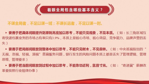 戰(zhàn)略目標(biāo)既定,中心任務(wù)已明,怎么落地?黨課不僅交任務(wù),也教方法,從著眼全局、突出重點(diǎn)、兼顧各方、照應(yīng)階段、抓住機(jī)遇、做好結(jié)合這6個(gè)方面詮釋了提升戰(zhàn)略思維能力的方法和步驟。時(shí)而引經(jīng)據(jù)典,時(shí)而對(duì)比國(guó)內(nèi)外同業(yè),黨課把高深的理論變?yōu)橥ㄋ滓锥闹v解。