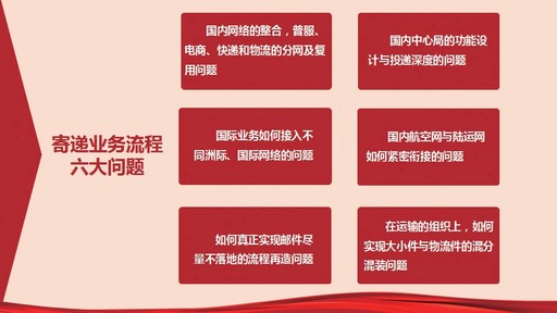 我們現(xiàn)在在流程方面主要有六大問(wèn)題,大家一定要認(rèn)真研究解決。一是國(guó)內(nèi)網(wǎng)絡(luò)的整合,普服、電商、快遞和物流的分網(wǎng)及復(fù)用問(wèn)題。哪些地方需要分網(wǎng)?是基于流量還是基于客戶不同的需求?到底怎么辦?德國(guó)郵政DHL有完全獨(dú)立的四大公司,是四個(gè)獨(dú)立的法人,但是DHL在德國(guó)農(nóng)村仍然是一個(gè)網(wǎng)絡(luò)服務(wù),我們?cè)趺崔k?二是國(guó)內(nèi)中心局的功能設(shè)計(jì)與投遞深度的問(wèn)題。要研究是不是需要一個(gè)個(gè)孤立的分揀中心,然后經(jīng)過(guò)三次、四次分揀,不停落地?要不要集包?能不能直接分揀到段道口?三是國(guó)際業(yè)務(wù)如何接入不同洲際、國(guó)際網(wǎng)絡(luò)的問(wèn)題。四是國(guó)內(nèi)航空網(wǎng)與陸運(yùn)網(wǎng)如何緊密銜接的問(wèn)題。DHL在萊比錫有一個(gè)分揀中心,他們的航運(yùn)中心一邊坐著陸運(yùn)的人,一邊坐著空運(yùn)的人,中間坐著所謂的管理層,天氣預(yù)報(bào)的大屏幕就在后面,一旦出現(xiàn)問(wèn)題,比如哪個(gè)國(guó)際方向不能飛了,改陸路怎么改,幾個(gè)部門(mén)的人一協(xié)商,馬上進(jìn)行車輛調(diào)度,然后就可以從空運(yùn)轉(zhuǎn)陸運(yùn),同樣可以實(shí)現(xiàn)次日遞或者隔日遞。而我們南京集散中心,有沒(méi)有陸運(yùn)的人?空運(yùn)和陸運(yùn)怎么結(jié)合?不能因?yàn)樘焐洗騻€(gè)雷,飛機(jī)不能落地就不運(yùn)了,結(jié)果客戶寄的櫻桃爛了,草莓也爛了。五是如何真正實(shí)現(xiàn)郵件盡量不落地的流程再造問(wèn)題,我們這里說(shuō)的11個(gè)環(huán)節(jié)、18個(gè)過(guò)程,實(shí)際上還不止這些,中間還有幾次分揀。六是在運(yùn)輸?shù)慕M織上,如何實(shí)現(xiàn)大小件與物流件的混分混裝問(wèn)題。這些問(wèn)題都是影響我們生產(chǎn)效率的核心問(wèn)題,大家一定要認(rèn)真研究解決。所以,我們說(shuō)首先要解決“有人看、有人干”的問(wèn)題,就是要讓大家多看報(bào)表、多找問(wèn)題,然后研究解決改善的辦法。