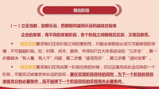 “照應(yīng)階段”一是立足當(dāng)前、放眼長(zhǎng)遠(yuǎn),把眼前利益與長(zhǎng)遠(yuǎn)利益結(jié)合起來(lái)。企業(yè)發(fā)展有不同的階段,每一個(gè)階段既相互區(qū)別,又相互聯(lián)系。