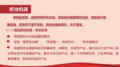 能否抓住機(jī)遇,攸關(guān)生死。當(dāng)前,我們要以持續(xù)落實(shí)中央巡視整改要求為契機(jī),認(rèn)真查找企業(yè)改革發(fā)展中存在的問(wèn)題,以整改促發(fā)展,堅(jiān)持問(wèn)題導(dǎo)向,堅(jiān)持高質(zhì)量發(fā)展,堅(jiān)持質(zhì)量第一、效益優(yōu)先,堅(jiān)持新發(fā)展理念,努力打造行業(yè)的“國(guó)家隊(duì)”。比如,快遞物流業(yè)是支撐國(guó)民經(jīng)濟(jì)發(fā)展的基礎(chǔ)性、戰(zhàn)略性、先導(dǎo)性產(chǎn)業(yè),是社會(huì)化大生產(chǎn)和人民日常生活不可或缺的產(chǎn)業(yè),是方興未艾的產(chǎn)業(yè),是一個(gè)市場(chǎng)有需求、行業(yè)有效益、國(guó)家有要求、郵政有優(yōu)勢(shì)的產(chǎn)業(yè),我們必須搶抓機(jī)遇、加快發(fā)展,否則,我們就會(huì)徹底丟掉這個(gè)市場(chǎng),丟掉核心業(yè)務(wù),郵政何以立足。
