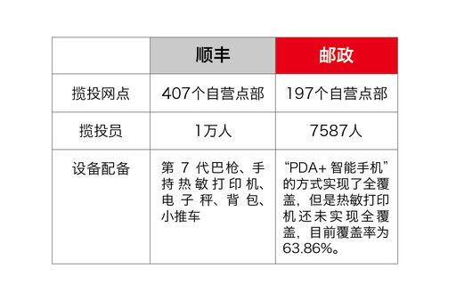 不只在網(wǎng)運(yùn)方面,郵政在攬收、投遞等環(huán)節(jié)上與競(jìng)爭(zhēng)對(duì)手也存在差距。從攬收能力上來(lái)說(shuō),以河北為例,順豐有攬投網(wǎng)點(diǎn)407個(gè),郵政寄遞事業(yè)部有269個(gè);順豐有一線攬投員1萬(wàn)人,寄遞事業(yè)部有7587人。在設(shè)備配備方面,順豐配有第7代巴槍、手持熱敏打印機(jī)、電子秤、背包、小推車;河北郵政通過(guò)“PDA+智能手機(jī)”的方式實(shí)現(xiàn)了全覆蓋,但是熱敏打印機(jī)還未實(shí)現(xiàn)全覆蓋,目前覆蓋率為63.86%。(見(jiàn)圖表2)