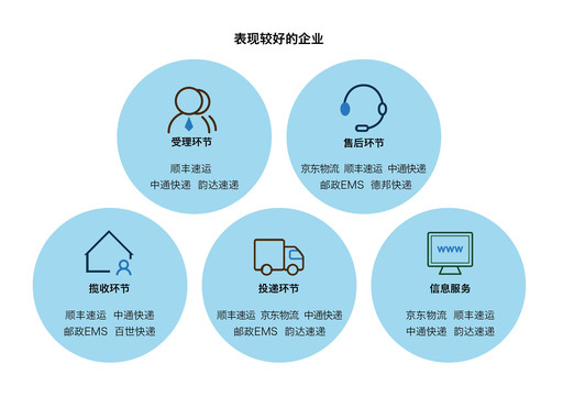 4月24日,國(guó)家郵政局發(fā)布了關(guān)于2019年第一季度快遞服務(wù)滿意度調(diào)查和時(shí)限準(zhǔn)時(shí)率測(cè)試結(jié)果的通告,在快遞企業(yè)公眾滿意度方面,得分在80分以上的企業(yè)為順豐速運(yùn)、京東物流,得分在76-80分之間的企業(yè)為郵政EMS、中通快遞、韻達(dá)速遞、申通快遞、圓通速遞和百世快遞。(見(jiàn)圖表3)在此之前,國(guó)家郵政局發(fā)布2018年快遞服務(wù)用戶滿意度、時(shí)限準(zhǔn)時(shí)率調(diào)查結(jié)果。快遞企業(yè)總體滿意度排名依次為:順豐速運(yùn)、郵政EMS、京東物流、中通快遞、韻達(dá)速遞、圓通速遞、百世快遞、申通快遞、德邦快遞、優(yōu)速快遞。在受理環(huán)節(jié)表現(xiàn)較好的企業(yè)有:順豐速運(yùn)、中通快遞和韻達(dá)速遞;在攬收環(huán)節(jié)表現(xiàn)較好的企業(yè)有:順豐速運(yùn)、中通快遞、郵政EMS、百世快遞;投遞環(huán)節(jié)表現(xiàn)較好的企業(yè)有:順豐速運(yùn)、京東物流、中通快遞、郵政EMS、韻達(dá)速遞;售后環(huán)節(jié)表現(xiàn)較好的企業(yè)有:京東物流、順豐速運(yùn)、中通快遞、郵政EMS和德邦快遞。信息服務(wù)方面表現(xiàn)較好的企業(yè)有:京東物流、順豐速運(yùn)、中通快遞、韻達(dá)速遞。(見(jiàn)圖表4)