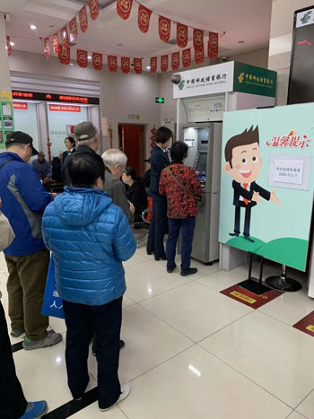 東四郵局副局長(zhǎng)樊潔:“6000元以下養(yǎng)老金提取,這里是綠色通道,請(qǐng)您到這里來排隊(duì)……”