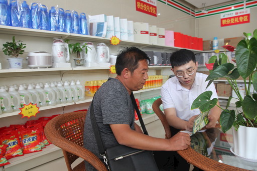東古城郵政支局理財經(jīng)理向客戶介紹積分兌換政策。