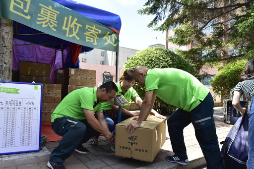 6月中旬,吉林省郵政分公司啟動(dòng)畢業(yè)季校園包裹項(xiàng)目,選派專職攬收員進(jìn)駐校園,為畢業(yè)生提供免費(fèi)上門取件、包裝等服務(wù)。該分公司還利用線上掃碼自助下單平臺(tái),提高電子面單使用率,同時(shí)宣傳郵政包裝箱綠色、環(huán)保、可循環(huán)性,助力綠色郵政建設(shè)。圖為郵政工作人員在吉林大學(xué)校園內(nèi)設(shè)點(diǎn)收寄畢業(yè)生包裹  □吉林記者  郭慧婷  通訊員  孫作偉  攝影報(bào)道