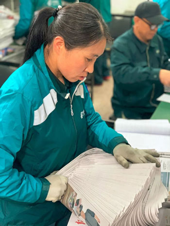 東四郵局投遞部的早晨是從7點(diǎn)開(kāi)始的。砸郵戳、數(shù)報(bào)紙、分信件,忙而不亂。幾十斤重的一厚摞報(bào)紙?jiān)业阶雷由?,只?jiàn)他們右手一翻變成漂亮的扇面,左手拇指和食指一抬一壓快速掠過(guò),轉(zhuǎn)瞬間每個(gè)人就數(shù)出了自己要送的報(bào)紙數(shù)量。