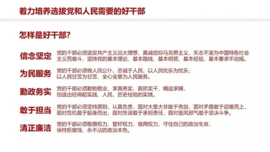 習(xí)近平總書記強(qiáng)調(diào),好干部的標(biāo)準(zhǔn),大的方面說,就是德才兼?zhèn)?。同時(shí),好干部的標(biāo)準(zhǔn)又是具體的、歷史的。不同歷史時(shí)期,對(duì)干部德才的具體要求有所不同。