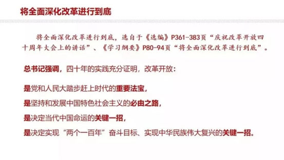 劉愛力在領(lǐng)學(xué)《將全面深化改革進(jìn)行到底》相關(guān)內(nèi)容時(shí)表示,習(xí)近平總書記深刻闡釋了全面深化改革是有方向、有立場(chǎng)、有原則的。總目標(biāo):完善和發(fā)展中國特色社會(huì)主義制度、推進(jìn)國家治理體系和治理能力現(xiàn)代化。出發(fā)點(diǎn)和落腳點(diǎn):促進(jìn)社會(huì)公平正義、增進(jìn)人民福祉。哪里有不符合社會(huì)公平正義的問題,哪里就需要改革;哪個(gè)領(lǐng)域哪個(gè)環(huán)節(jié)問題突出,哪個(gè)領(lǐng)域哪個(gè)環(huán)節(jié)就是改革的重點(diǎn)。