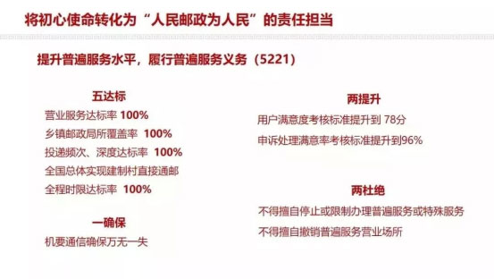 針對(duì)中央巡視指出的我們存在“無視、忽視、輕視、漠視”普遍服務(wù)的問題,普遍服務(wù)責(zé)任落實(shí)有差距,普遍服務(wù)質(zhì)量管控有差距,普遍服務(wù)質(zhì)量信息化支撐有差距,普遍服務(wù)網(wǎng)絡(luò)效能有差距,我們要努力提升普遍服務(wù)水平,履行普遍服務(wù)義務(wù),實(shí)現(xiàn)“5221”目標(biāo)。