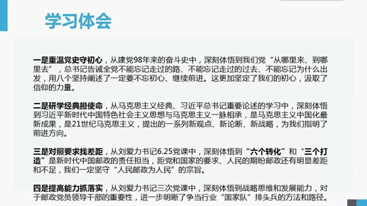 江蘇省郵政分公司黨組書記、總經(jīng)理曹明則用重溫黨史守初心、研學(xué)經(jīng)典擔(dān)使命、對照要求找差距、提高能力抓落實表達(dá)了自己參加此次集中學(xué)習(xí)研討的體會。