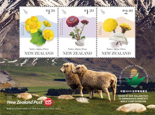新西蘭于6月11日發(fā)行“中國2019世界集郵展覽”郵票小全張,郵票圖案為“新西蘭高山植物”,小全張邊飾以新西蘭風(fēng)景配上新西蘭郵政標(biāo)識和此次世界郵展標(biāo)識(圖2)。