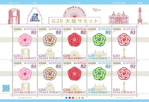 在第二季度中,最受全球關(guān)注的非在大阪舉行的二十國集團(tuán)領(lǐng)導(dǎo)人峰會莫屬。日本為此發(fā)行了一套5枚郵票,圖案采用日本水引,為呼應(yīng)主辦地大阪,郵票圖案的水引為梅花造型(圖5)。水引是日本儀式禮品上的繩結(jié),代表結(jié)緣或是召喚幸福。郵票下方5個大阪地標(biāo),包括梅田藍(lán)天大廈、大阪城、大阪國際會展中心、大阪市中央公會堂、通天閣。此次峰會標(biāo)志以富士山為設(shè)計主題,富士山的“山頂”和“朝日”象征著全球經(jīng)濟增長和繁榮。在富士山的下面,盛開的櫻花象征著春天的到來,也預(yù)示著全球經(jīng)濟的美好未來。