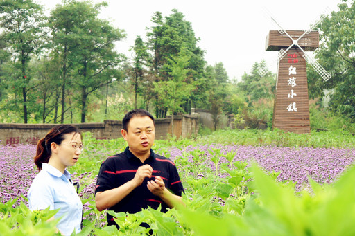 王靜華(右)向郵儲銀行信貸員介紹“紅旅小鎮(zhèn)”。