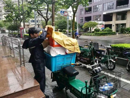 上海:臺風(fēng)天氣,上海市1.1萬名“郵政小哥”一如既往堅守投遞一線,不負客戶所托,確保百姓用郵。李璐瑤 攝
