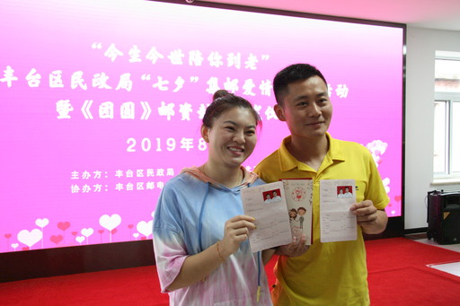 當(dāng)天,豐臺區(qū)民政局與豐臺區(qū)郵政分公司聯(lián)合制作、特別推出了“今生今世陪你到老”紀念郵折,并首發(fā)一套主題為“十全十美”寓意的紀念郵戳,涵蓋“陪你到老”“愛由心生”“天作之合”“天長地久”“今生今世”“永結(jié)同心”“愛你一生”“情投意合”“相親相愛”“長相廝守”10個美好祝福詞。凡是當(dāng)日到豐臺區(qū)民政局婚姻登記處領(lǐng)取結(jié)婚證的新人,都可以免費獲贈紀念郵折一套,并加蓋任意紀念郵戳。“七夕是我國紀念愛情的傳統(tǒng)節(jié)日,選擇這一天領(lǐng)證對我們來說有著特殊的含義。我一直很羨慕父母輩的愛情,選一人伴一生,所以,這次我和他選擇了‘陪你到老’這枚郵戳,希望我們能白頭偕老。”田女士說。