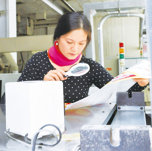 郵票設(shè)計者原藝珊查看郵票印制情況。 記者 陸航 攝