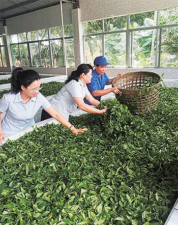 白沙縣支行信貸經理走訪白沙茶廠,了解茶葉質量。