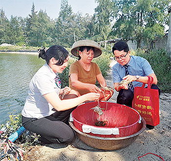 儋州市支行信貸經理了解螃蟹養(yǎng)殖戶生產情況。