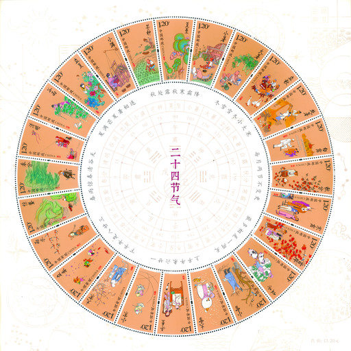 王虎鳴在小全張邊飾設(shè)計(jì)上使用了中國古代數(shù)學(xué)、天文學(xué)著作中的元素,包含日、月、星斗、算酬、古人描繪的天與地關(guān)系圖、紫微垣以及古星圖等。這些元素描繪了中國古人如何通過觀察自然來確定二十四節(jié)氣,從事農(nóng)業(yè)生產(chǎn)和生活。郵票中心的圓中將太極、地支、黃道度數(shù)與二十四節(jié)氣的對(duì)應(yīng)關(guān)系進(jìn)行了展現(xiàn),進(jìn)一步闡明了中國傳統(tǒng)文化的博大精深和相互聯(lián)系,也表達(dá)了中華民族一直以來注重人與自然的關(guān)系,講究天人合一的思想。