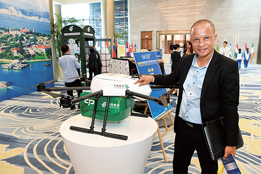 現(xiàn)場展示的郵政無人機和無人投遞車。