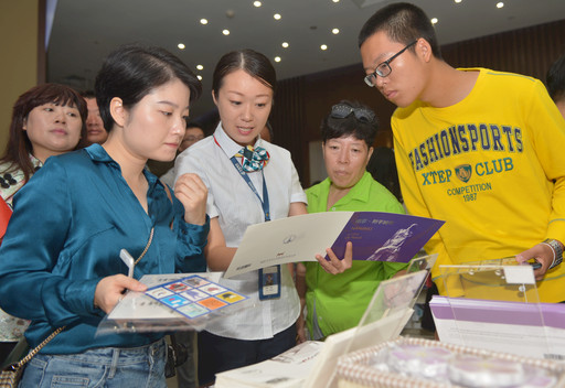 紫金草和平郵局員工為游客介紹郵品。