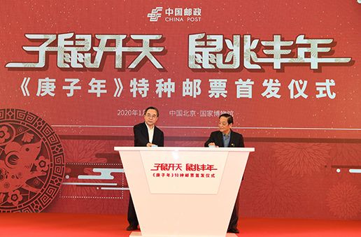 1月5日,《庚子年》特種郵票首發(fā)儀式在中國國家博物館舉行。該套郵票設(shè)計(jì)者、著名藝術(shù)家韓美林,中國郵政集團(tuán)有限公司董事長劉愛力、國家博物館館長王春法等出席儀式。劉愛力與韓美林共同為《庚子年》特種郵票揭幕。