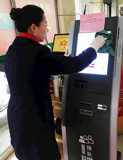湖南省長沙市岳麓區(qū)郵政分公司日前組織員工對網(wǎng)點進行全面消毒,并在機具上粘貼“本日已消毒”告示。要求網(wǎng)點每日安排專人負責消毒工作,讓郵政客戶放心進入網(wǎng)點辦理郵政業(yè)務。圖為銀盆嶺郵政網(wǎng)點員工對叫號機進行消毒。□桂藝 攝影報道