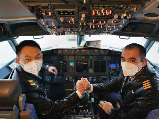 1月27日,黃宏佳(左)執(zhí)飛首班郵航防疫物資寄遞專機(jī),從廣州飛往武漢。詹威東 攝