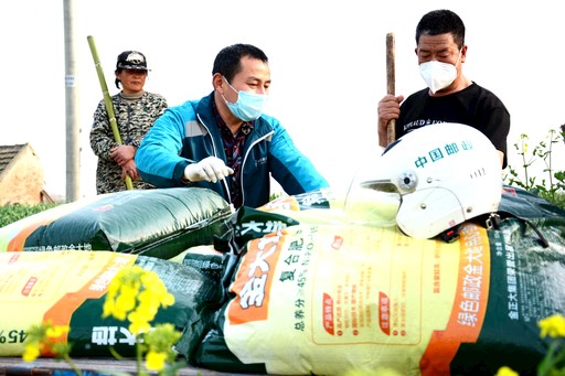 江蘇省射陽縣郵政分公司開展“戰(zhàn)疫情、搶農(nóng)時(shí)、郵我助,郵農(nóng)一心保春耕“活動(dòng),基層員工利用班前班后時(shí)間將農(nóng)民需要的復(fù)合肥配送到農(nóng)民家門口、田間地頭,并組織志愿者協(xié)助缺勞力戶為莊稼施肥鋤草。截至3月17日,該分公司已向全縣農(nóng)民配送復(fù)合肥546噸,幫助17戶缺勞力戶解除農(nóng)活上的后顧之憂。圖為通洋支局投遞員將肥料送到農(nóng)戶地頭?!鮿⒌铝?nbsp; 攝影報(bào)道