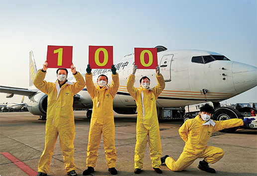 3月21日,郵航CF9016航班于7點(diǎn)19分飛抵武漢天河機(jī)場,飛行員在機(jī)場擺起pose,慶祝中國郵政航空執(zhí)飛疫區(qū)航班100架次這一榮耀時刻。