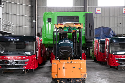 重慶郵政員工孫西滿正駕駛著叉車裝運(yùn)上汽紅巖重卡配件。 朱亞坤 攝