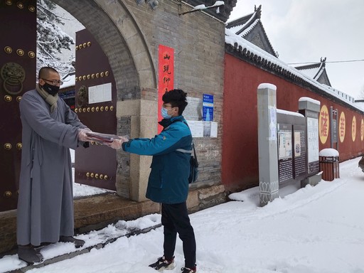 接下來(lái),高健喻到了第二個(gè)投遞點(diǎn)——善財(cái)洞。由于疫情防控期間寺院實(shí)行封閉管理,到了寺院門口后,小高撥通客堂師父釋仁恒的電話,告知郵件來(lái)了。很快,釋仁恒打開(kāi)厚重的寺門接過(guò)報(bào)紙說(shuō):“小高,這么大的雪你還過(guò)來(lái)了?每天看看你送來(lái)的報(bào)紙,了解天下大事,對(duì)我們也是一種很好的修行?!?/p>