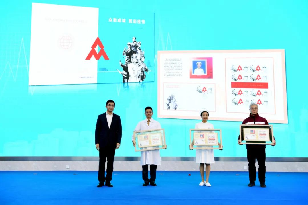 楊傳堂、梁言順、馬軍勝、李斌、梁惠玲、劉愛(ài)力、張金良共同為郵票揭幕,中央軍委后勤保障部衛(wèi)生局副局長(zhǎng)徐勤耕、財(cái)政部經(jīng)濟(jì)建設(shè)司一級(jí)巡視員宋秋玲、中國(guó)人口福利基金會(huì)副理事長(zhǎng)武家華、康寧共同為郵票首日封揭幕。劉愛(ài)力向中國(guó)紅十字會(huì)總會(huì)捐贈(zèng)抗擊疫情慈善款,張金良向北京醫(yī)院呼吸與危重癥醫(yī)學(xué)科副主任許小毛,北京大學(xué)人民醫(yī)院護(hù)理部護(hù)士長(zhǎng)趙彥,中國(guó)疾控中心駐黃岡檢測(cè)隊(duì)隊(duì)長(zhǎng)、病毒病所曾毅院士實(shí)驗(yàn)室副主任張曉光三名抗擊疫情醫(yī)務(wù)工作者代表捐贈(zèng)郵折。