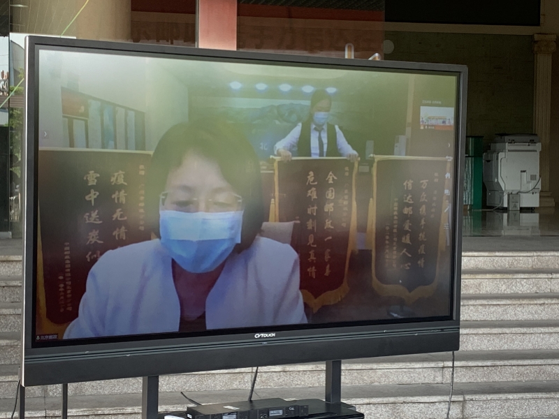 北京郵政副總經(jīng)理王艷遠(yuǎn)程展示錦旗。