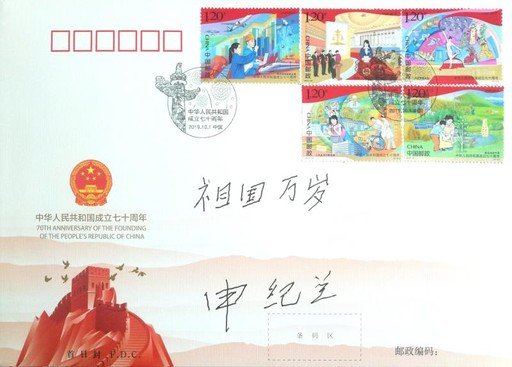2019年10月,申紀(jì)蘭在《中華人民共和國成立七十周年》首日封上題字。