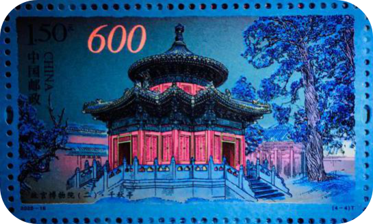 郵票采用黑、藍(lán)、紅、黃、金、無色紅熒光六色膠印。設(shè)計師和工藝團(tuán)隊一道,經(jīng)過多次特種金油墨配制和上機(jī)試制,反復(fù)比較色彩效果,才最終選定油墨。另外,在郵票的左上方藏有無色紅熒光油墨印制的“600”字樣,在紫光燈下才會顯現(xiàn)出來。