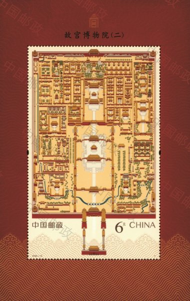 紫禁城建造技藝高超,內(nèi)在考究精妙,外在磅礴大氣,代表著當(dāng)時最高的建造水平。中央軸線上分布著三大殿(太和殿、中和殿以及保和殿)和后三宮(乾清宮、交泰殿以及坤寧宮),左右兩條次軸線上分別分布著慈壽宮、寧壽宮等宮殿。出于防御需要,宮殿建筑外圍筑有宮墻,四周分布有角樓,外有護(hù)城河環(huán)繞。故宮平面示意圖首次登上郵票,細(xì)膩、完整地呈現(xiàn)了故宮恢弘的建筑布局。