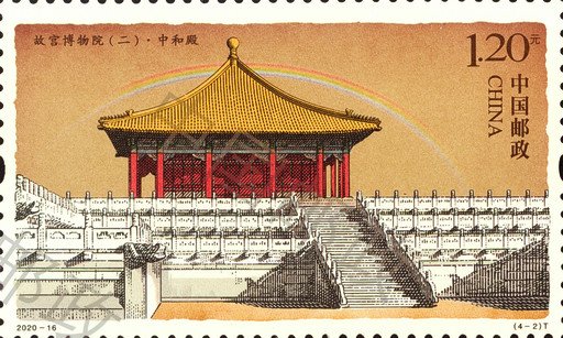 紫禁城建造技藝高超,內(nèi)在考究精妙,外在磅礴大氣,代表著當時最高的建造水平。中央軸線上分布著三大殿(太和殿、中和殿以及保和殿)和后三宮(乾清宮、交泰殿以及坤寧宮),左右兩條次軸線上分別分布著慈壽宮、寧壽宮等宮殿。出于防御需要,宮殿建筑外圍筑有宮墻,四周分布有角樓,外有護城河環(huán)繞。故宮平面示意圖首次登上郵票,細膩、完整地呈現(xiàn)了故宮恢弘的建筑布局。