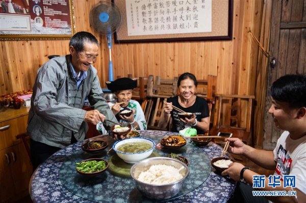 在湘西十八洞村,施成富(左一)和家人一起吃午餐(6月29日攝)。 新華社記者 陳思汗 攝