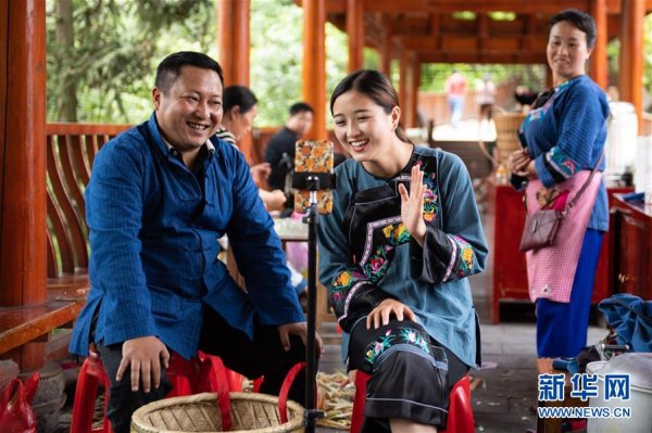 在湘西十八洞村,十八洞村扶貧隊長麻輝煌(左)與返鄉(xiāng)大學(xué)生施林嬌(中)一起直播推銷土特產(chǎn)(5月15日攝)。 新華社記者 陳思汗 攝