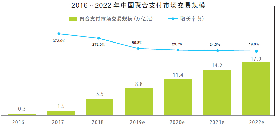 根據(jù)艾瑞咨詢統(tǒng)計,2019年聚合支付市場交易規(guī)模約為8.8萬億元,同比增長59.8%,預(yù)計未來該市場的增速將有所回落,但仍能保持較穩(wěn)定的增長。