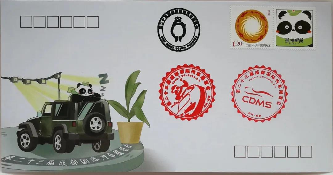 郵戳部分結(jié)合成都國際車展標(biāo)志設(shè)計(jì),選用流線型超跑元素結(jié)合熊貓郵局IP形象,豐富視覺表現(xiàn),外觀更是采用圓形鋸齒輪廓,區(qū)別于傳統(tǒng)郵戳形態(tài),給人耳目一新的感覺。