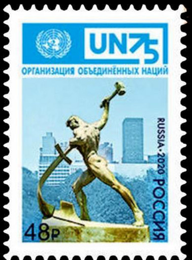5月22日,俄羅斯郵政發(fā)行1枚郵票紀念聯(lián)合國成立75周年。郵票圖案為雕塑《鑄劍為犁》,這是蘇聯(lián)于1957年送給聯(lián)合國的禮物,并于1958年布魯塞爾國際博覽會上榮獲大獎,是著名雕塑大師烏切吉奇的名作之一,代表了世界各國人民千百年來渴望和平的美好愿望。6月4日,德國郵政發(fā)行1枚郵票,慶賀聯(lián)合國建立75周年。