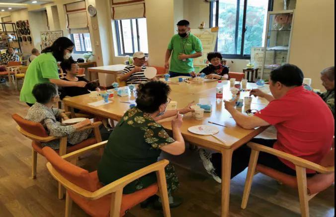 在三樓長(zhǎng)樂(lè)日間照料中心,專職社工正在教老人們繪畫(huà)填色。侯亞景 攝